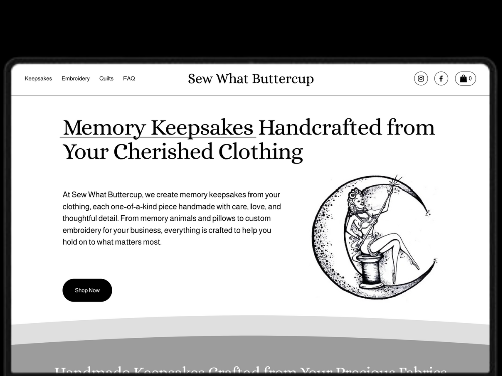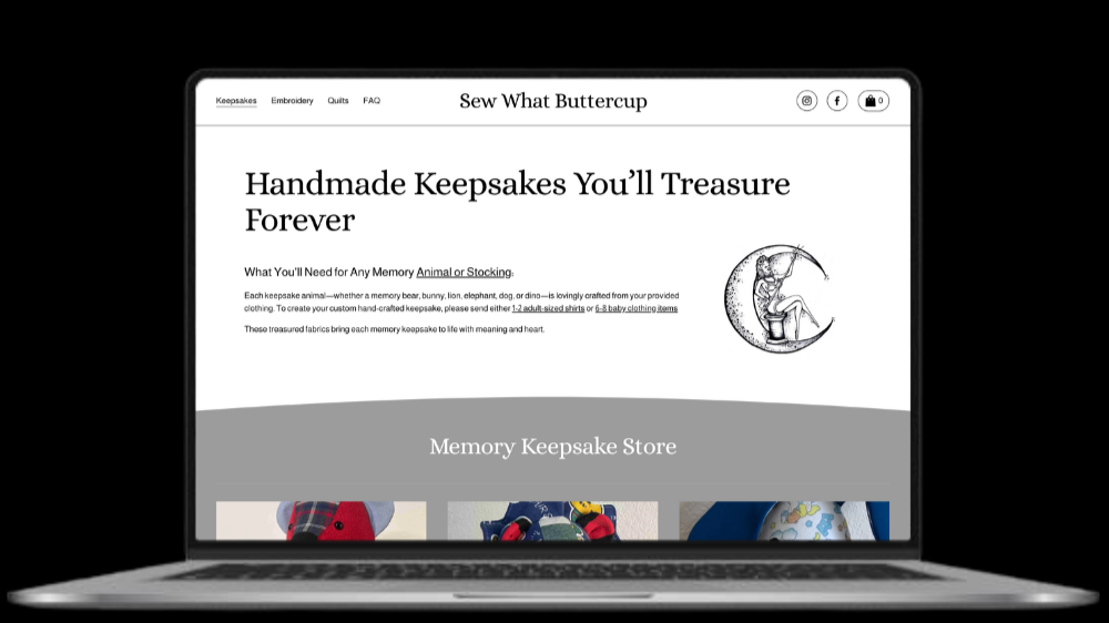 Sew What Buttercup is a sewing business specializing in custom memory keepsakes made from cherished clothing. They needed a website that showcased their handmade products, clearly explained the process, and guided customers smoothly from learning about the keepsakes to placing an order.