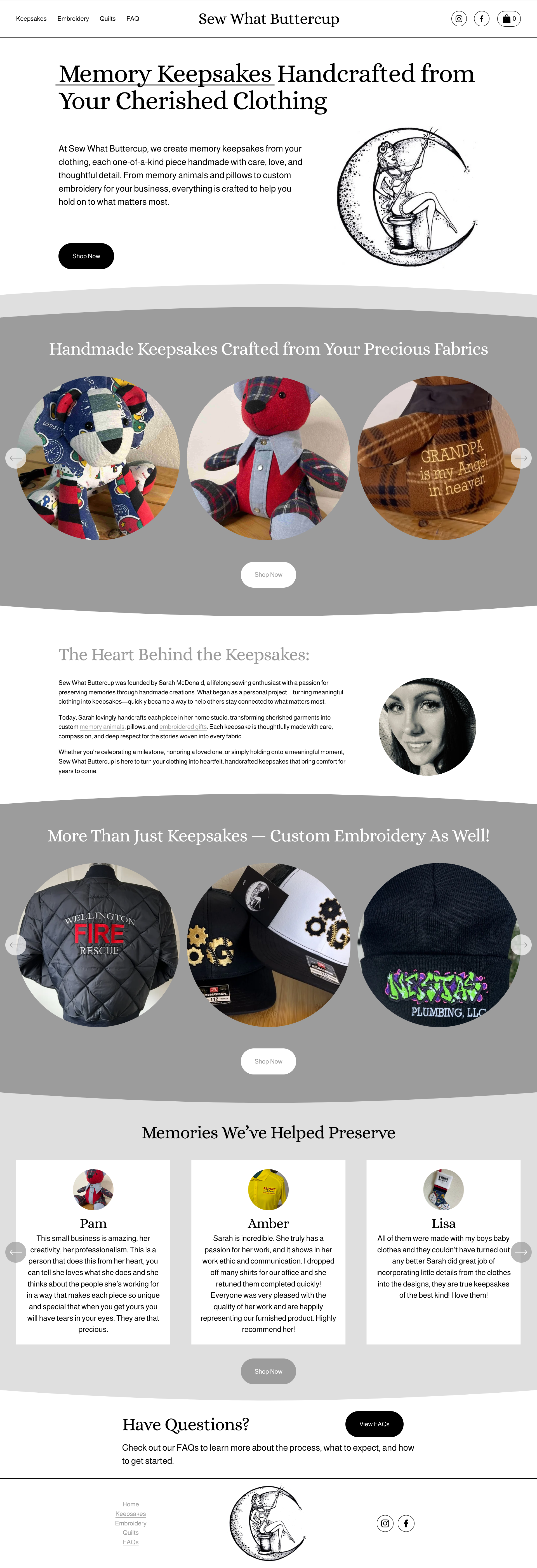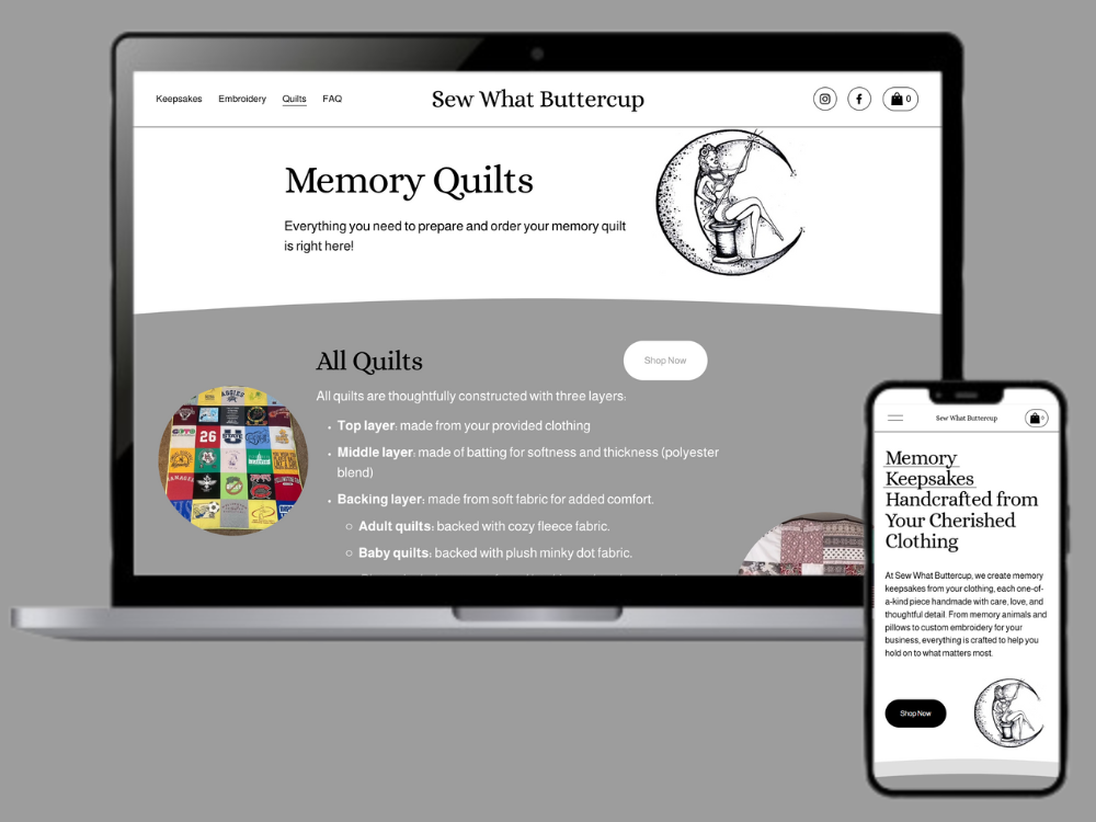 Sew What Buttercup needed a professional website to showcase and sell their custom memory keepsakes and custom embroidery services. The main focus was on creating a seamless shopping experience that highlighted the uniqueness of each product while guiding customers through the ordering process. To achieve this, the site required detailed product pages with custom options, a comprehensive quilt information section, an easy-to-navigate FAQ, and clear CTAs directing users to the shop. The design also had to balance gentleness and professionalism, reflecting the sentimental nature of the keepsakes while maintaining a streamlined shopping experience.